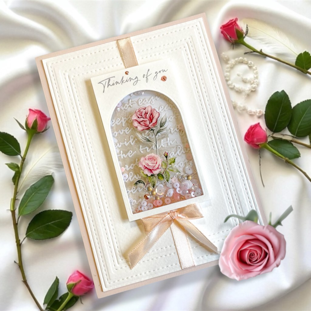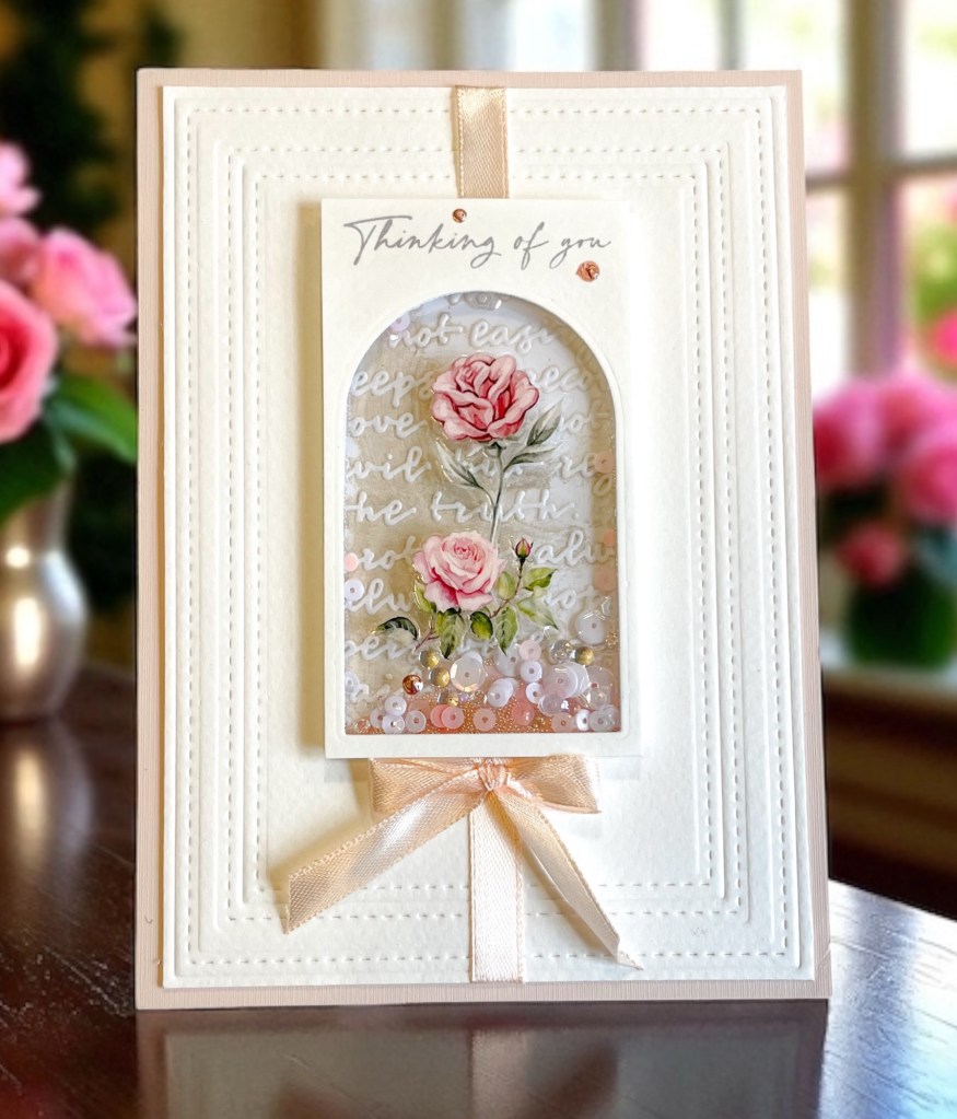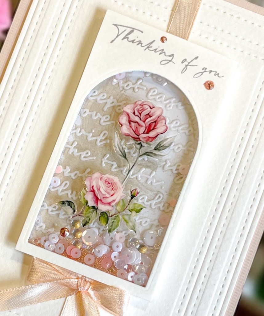 Shaker cards. You either love them or hate them. Can’t they be fussy? I do them sometimes and usually have to recover a few weeks before trying another 🙂 While trying this new genius way Tim showed, of course, I had a SHINY acetate window….Eureka! Perfect place for a shiny rub-on! And the creation was born.