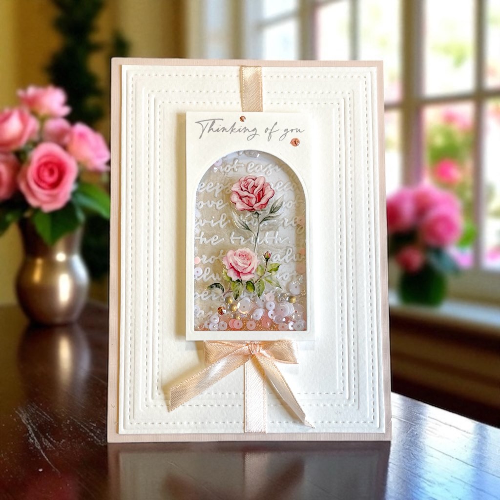 - Finishing touches/assembly. I wrapped ribbon around the panel and secured with tape on the back. Using double sided adhesive strips, I mounted that to a card base. Mount the shaker with strong adhesive. Finished off with a tied bow and 3 dots of stickles. What do you think?
