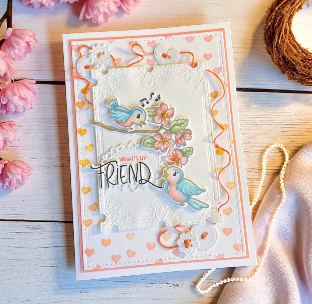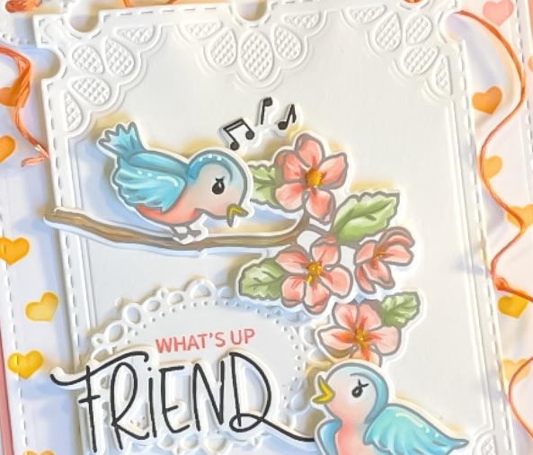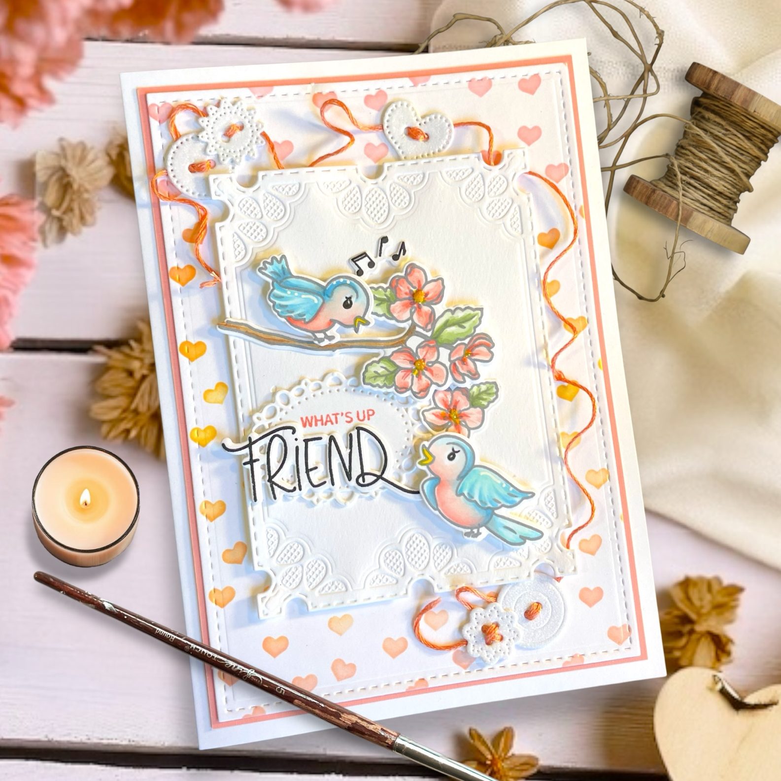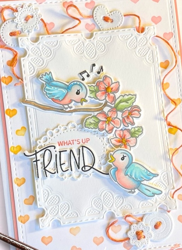 - Color and cut out the Sweet Tweet elements. From the Lace Heart Layering frame, cut 2 of these from white card stock. I used the center cutout from the frame and glued them together to give it some stability. From a lace doily die, I cut 1 from white card stock and stamped What’s up from the same ink used in the background stenciling. Using foam squares I popped up the birds and flowers. Assemble the panel the way you like it.