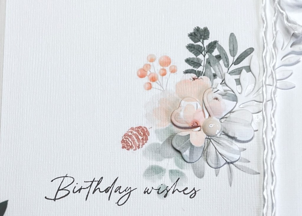 On the second panel I planned where the cutout flower would go and cut a flower and greenery with floral spellbinders dies from the area of the image that I wanted to add the floral cuts. Now all you have to do is stamp and assemble.