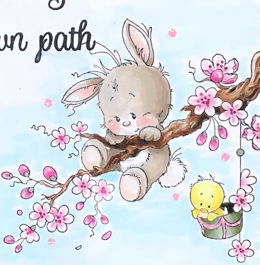Creating shadows. Regardless of the Medium, shadows are important. Since Copics are transparent, it makes it easier. When working on your shadows, keep in mind that all shadows are closer to the blue spectrum. You can use a darker hue of the same color, but if you choose a darker hue that is bluer in nature it will be more realistic. For instance, the branch deep shadows are actually a blue-gray instead of brown and the bunny deep shadows are muted purple instead of tan.