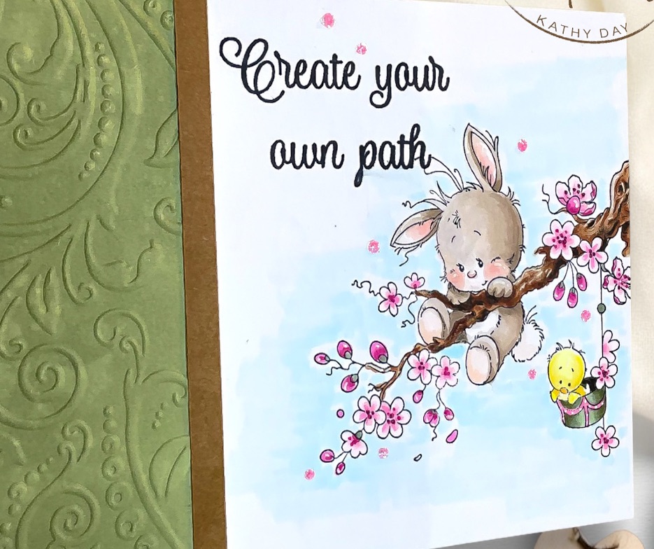Selecting colors can be a challenge for some. For me, I chose 3 colors I planned on using. Pink, Brown and Green. To make the card cohesive, any green that was colored was matched with an ink pad for the embossing technique and the same went for the Brown strip and the branch.