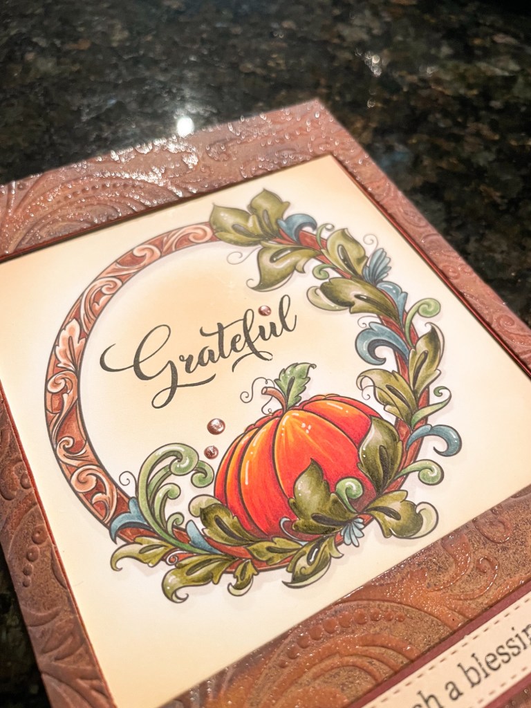 I started by coloring the autumn wreath with Copic markers, using muted fall colors. When choosing your colors remember that red and oranges are visually brought to the front so they will always look even brighter. You can download the Autumn Elegance Wreath here. Don’t trim the panel at this point we will do that at a later step..