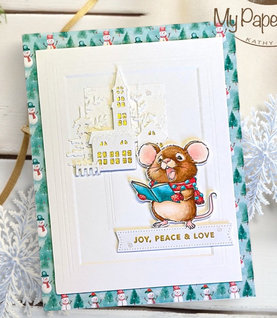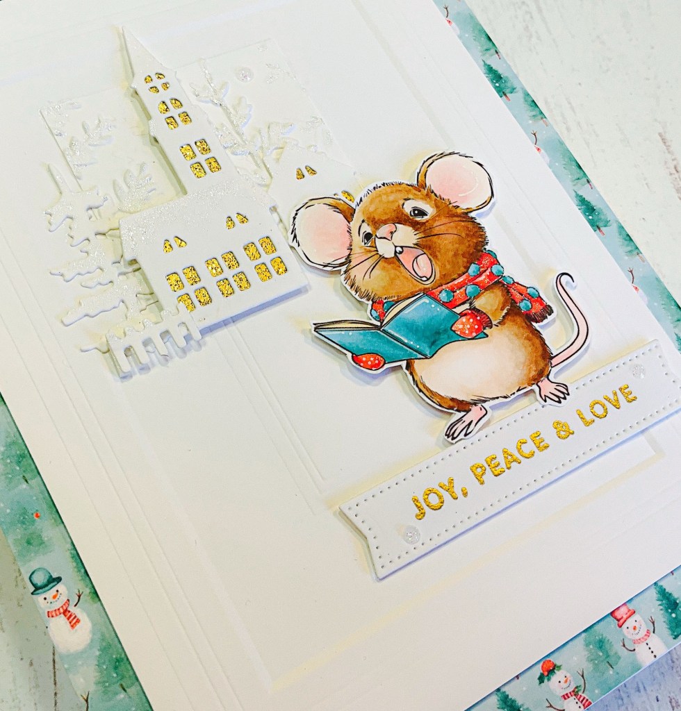 For the background I used the frame embossing folder along with Gina K’s Winter Wonderland dies to create my white on white scene. Behind the windows is embossed gold.