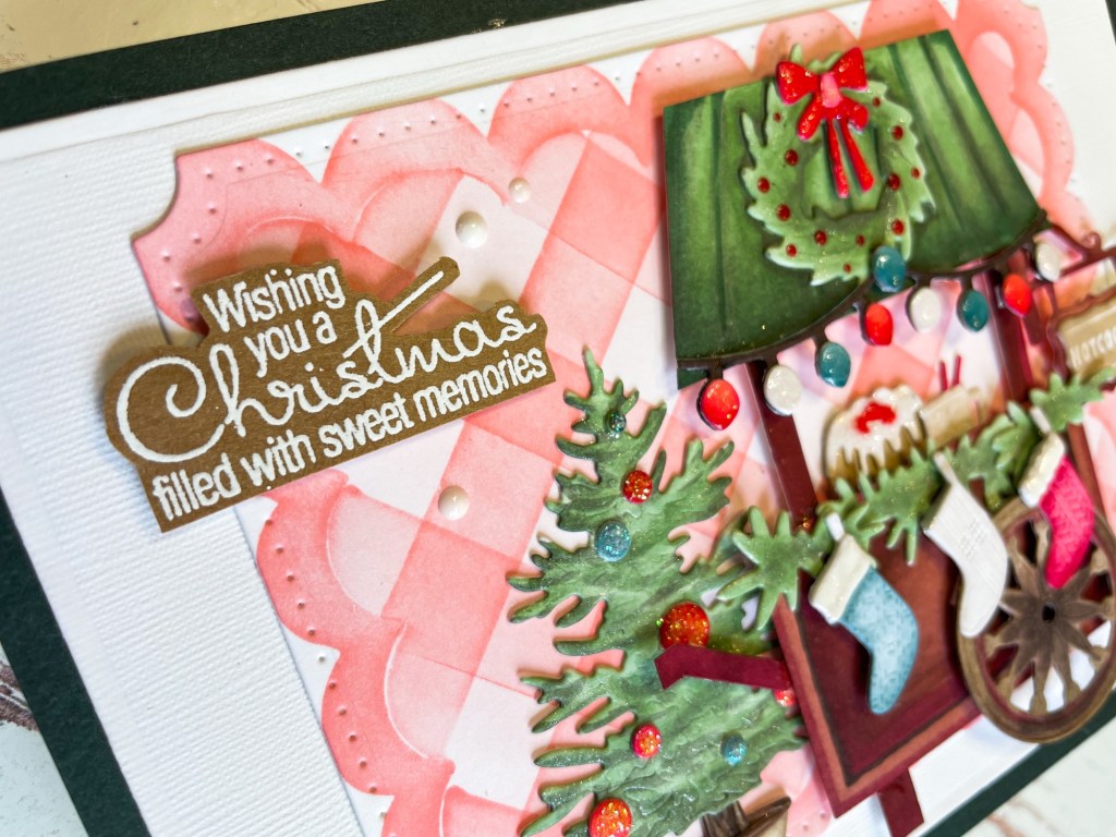 Finishing touches: Wreath – Bow has glossy accents and red Nuvo drops. String of lights have glossy accents. Cake has glossy accents with clear glitter and ornaments are topped with clear Nuvo glitter drops.
