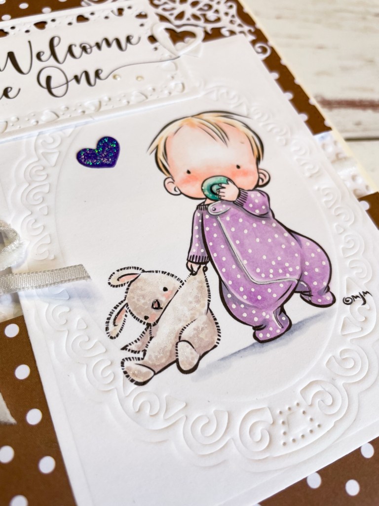 Starting with the adorable baby from MO’s digital pencil, I colored with Copics with a favorite color combination of lavender, teal and soft grey-brown.