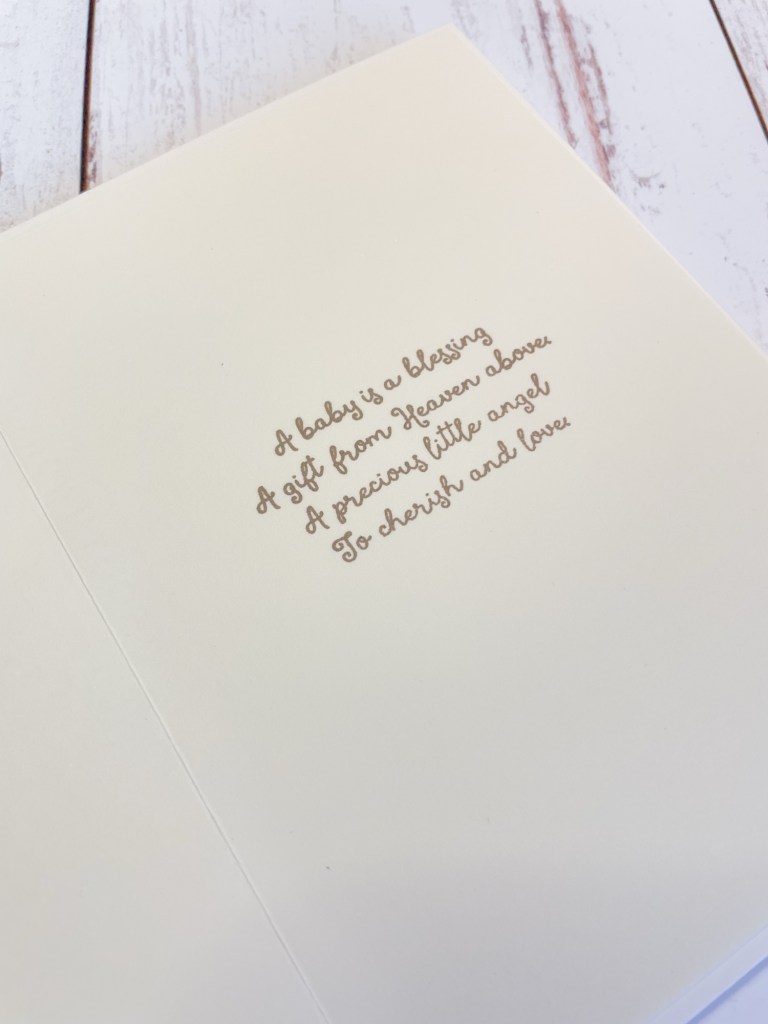 I start with the “knowns” . I know the size of the baby and the sentiment, so I went ahead and cut those panels. For the baby I embossed the frame using a die and embossing mat.