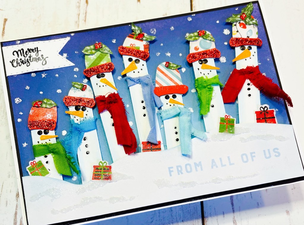 The holly and presents were also patterned paper that I fussy cut. Their eyes were Black stickles. The buttons and mouths were done with black pen.